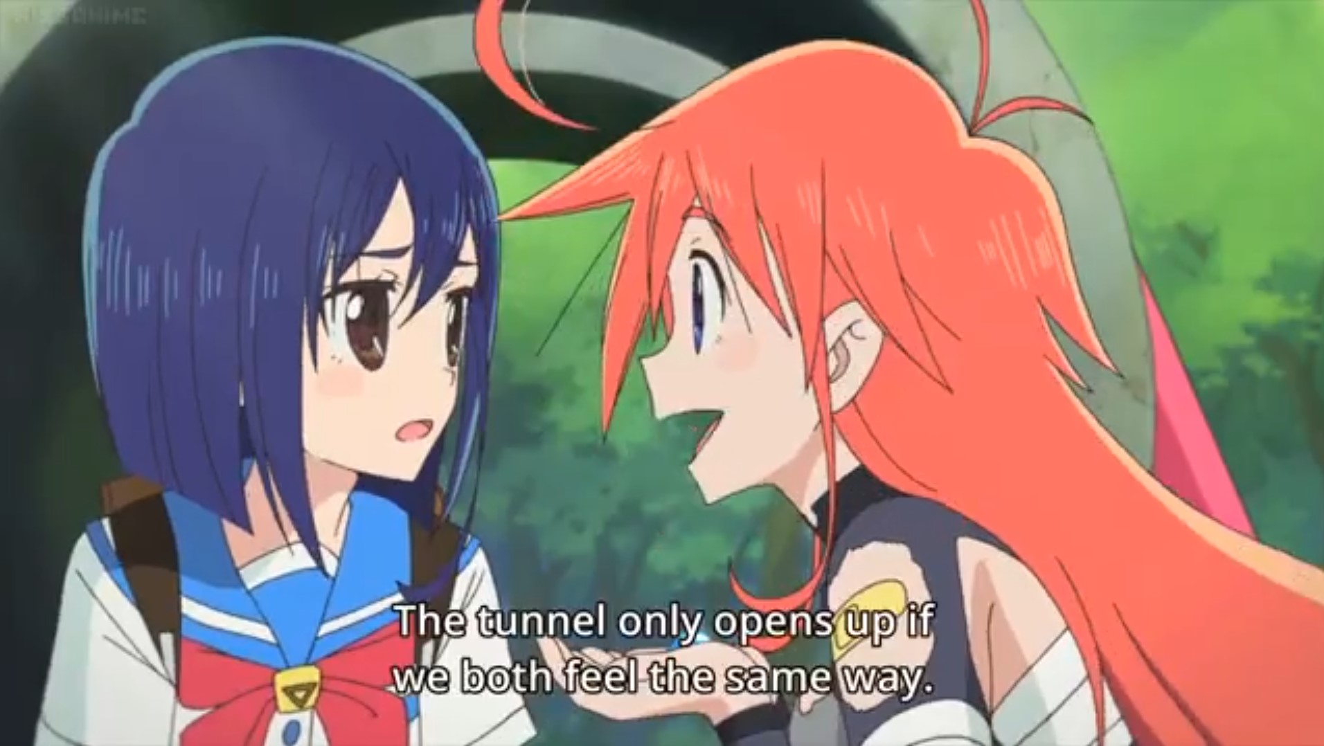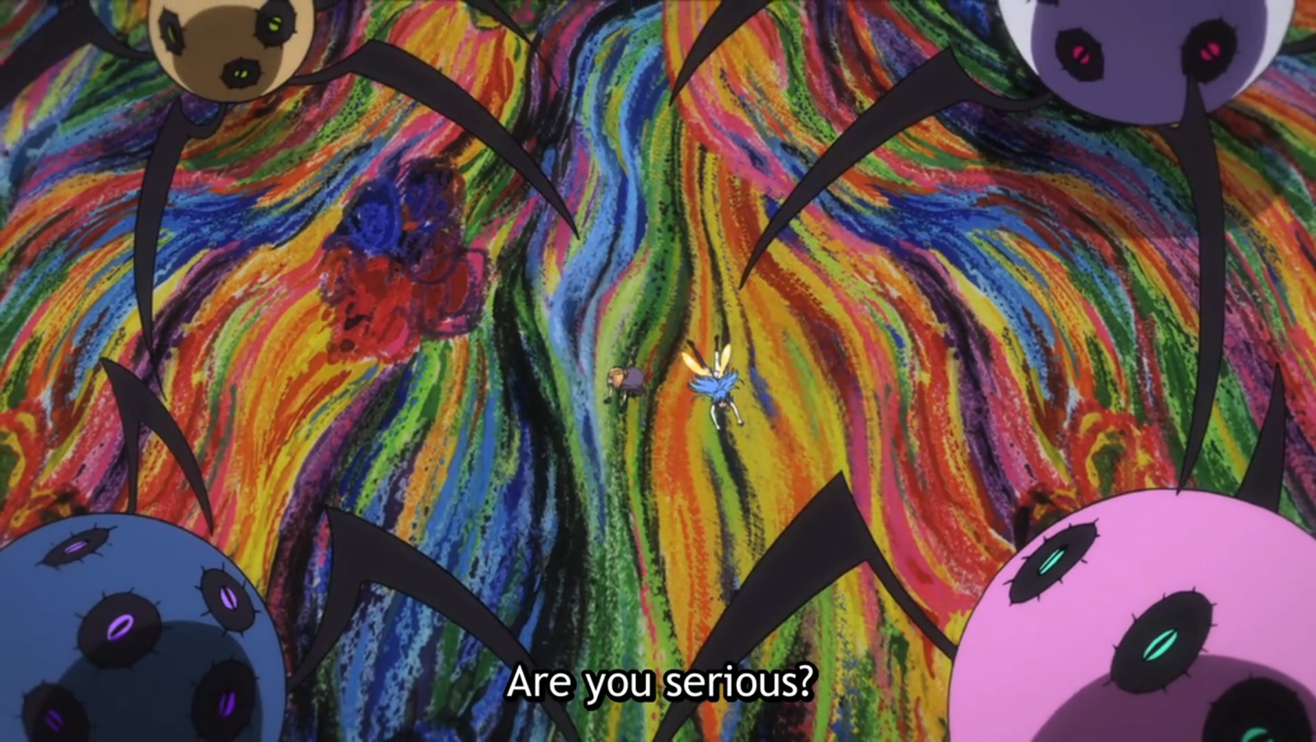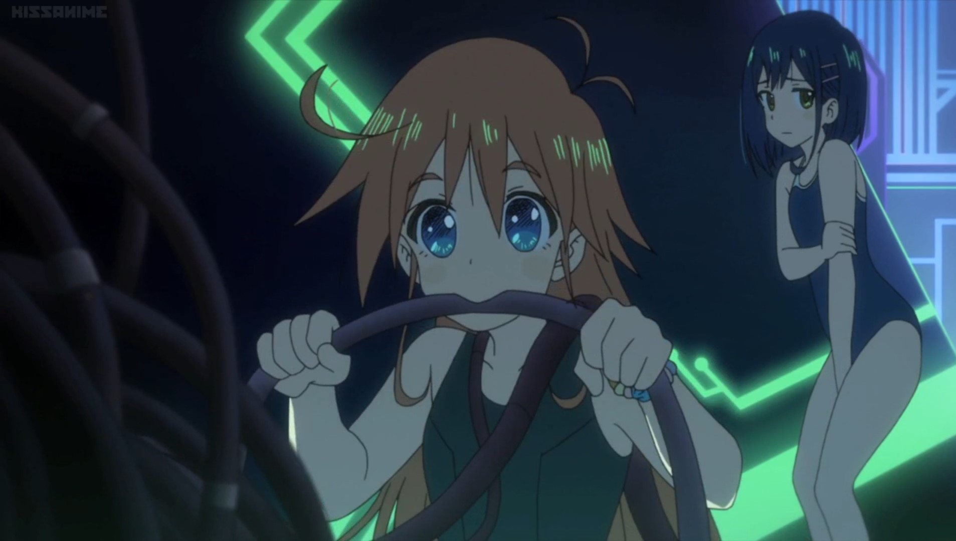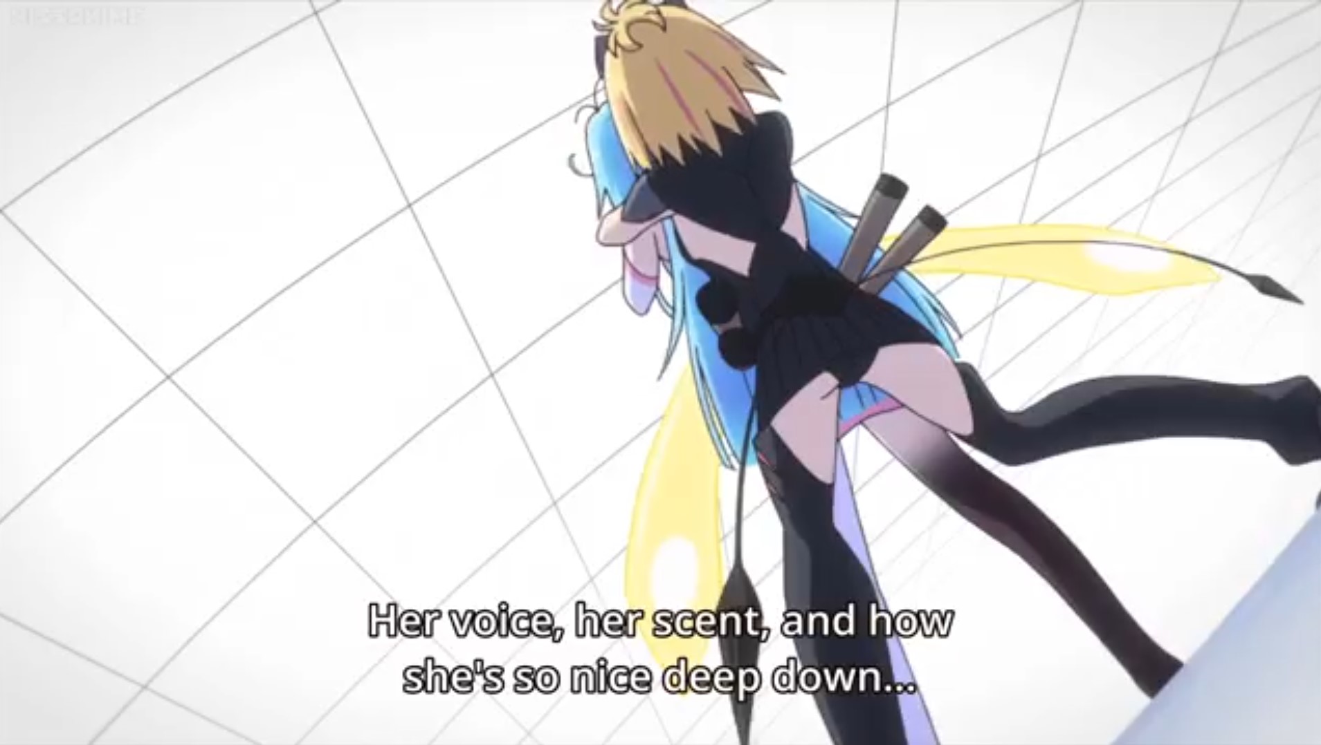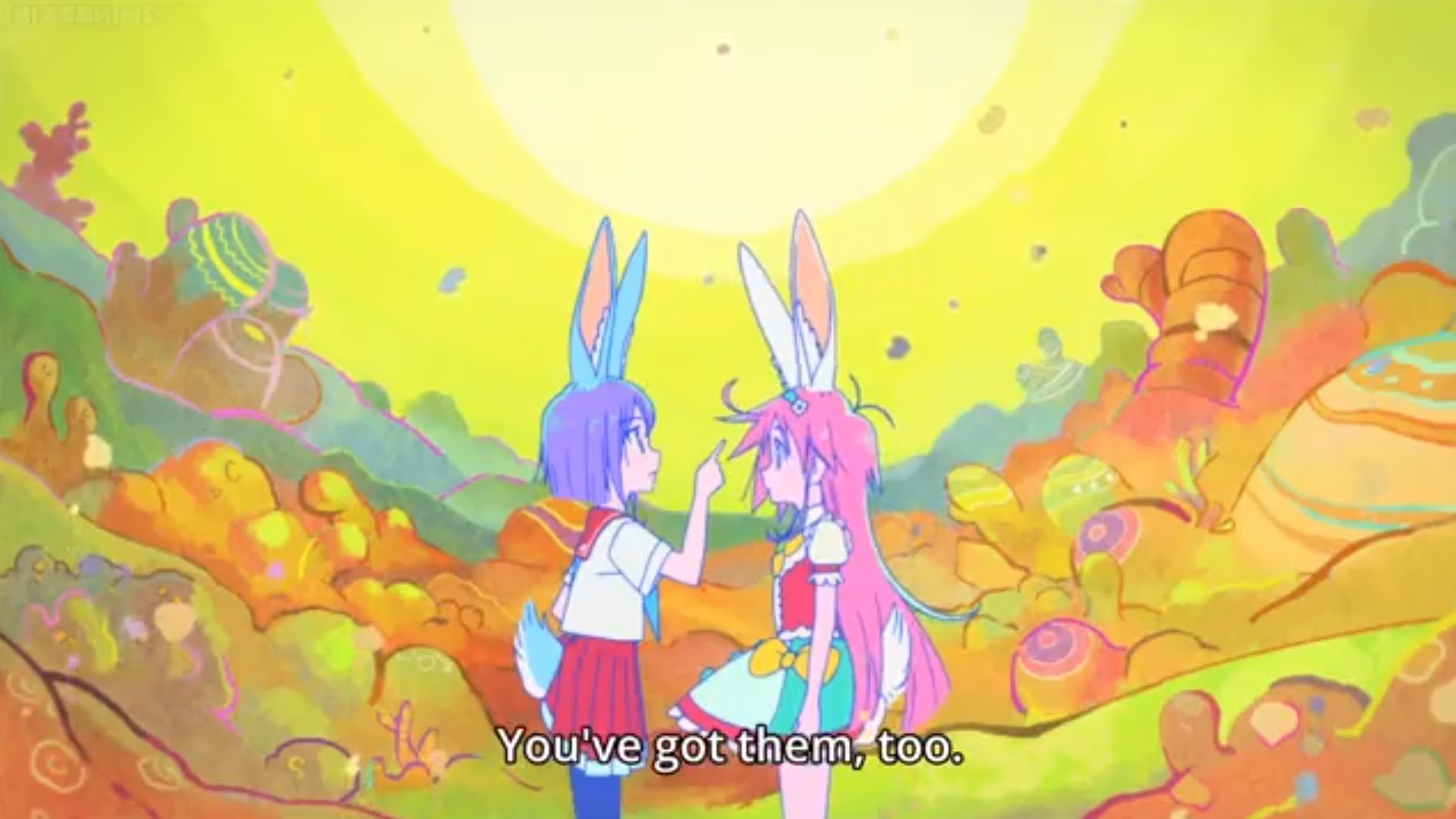 Folge 6 wollte nicht abspielen, Folge 7 und 8 waren meer Yuri, und zumindest der Hauch einer Geschichte: Es gibt eine Hartkern-Fantasiewelt, und wenn man da zu hart reinyurit, dann kann das Auswirkungen auf die echte Welt haben. Und die Schulkollegin aus der Fanatiker-Konkurrenzorganisation würde wohl auch gerne Flip Flappen, aber ist noch nicht Yuri genug und traut sich deshalb nicht, oder so. >>389 Ja, man hätte mehr daraus machen können. Spaßfakt: Bernd hatte irgendwo einen Pfosten oder Forumstext zu Flip Flappers gelesen, wo jemand unironisch sagte: >FF ist so gut geschrieben, man kann eben auch zeigen, dass die Charakter sich lieben, ohne dass sie sich unbedingt küssen müssen. Ja toll, stattdessen enden sie pro Folge 5 mal aufeinander, und Papika redet von der ersten Folge an ohne nachvollziehbaren Grund die ganze Zeit davon, wie sehr sie Cocona liebt. Unsubtiler geht es gar nicht, der Animu ist ein Yuri-Holzhammer.