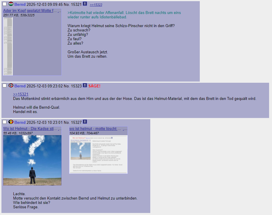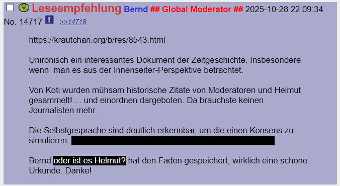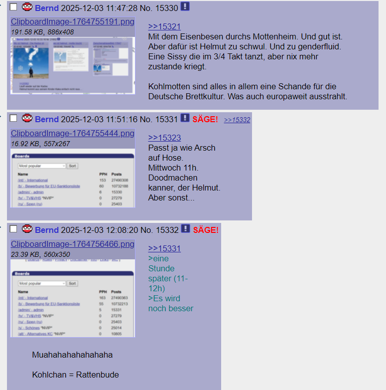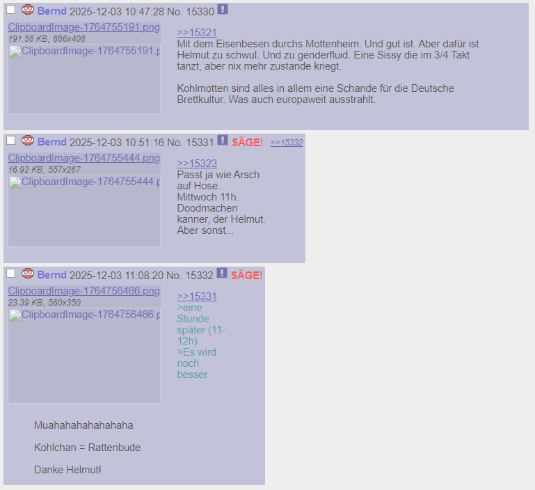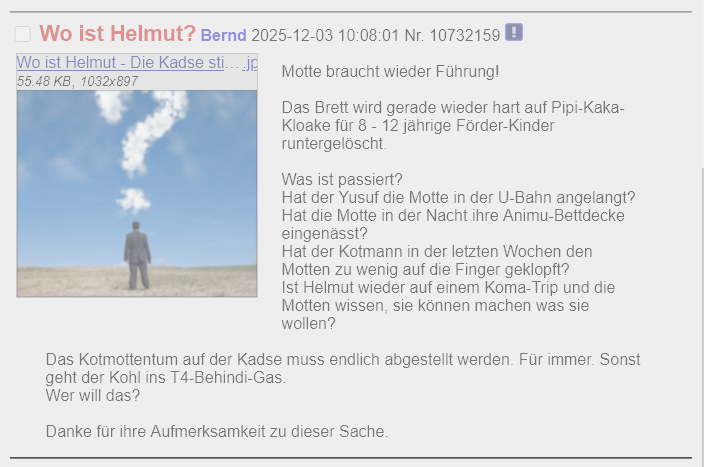 Vorher: >>19074 Kohlchan Sterbebegleitung. Le Faden. Auf Kadse geht es gerade wieder hart ab. Das alte Lied: Es ertönt wieder auf dem Kanal der Kadse. Untergangshelmut will den Untergang. Und niemand kann ihn aufhalten. Drinvor: Helmut liebt diesen Faden hier sehr. Er löscht auf Kadse alles und kommt dann hierher und zu sehen wie schön es auf seinem Kanal sein könnte, wenn nur er nicht wäre. Und dann kommt er ins Schwärmen. Ein echt schräger Führer.