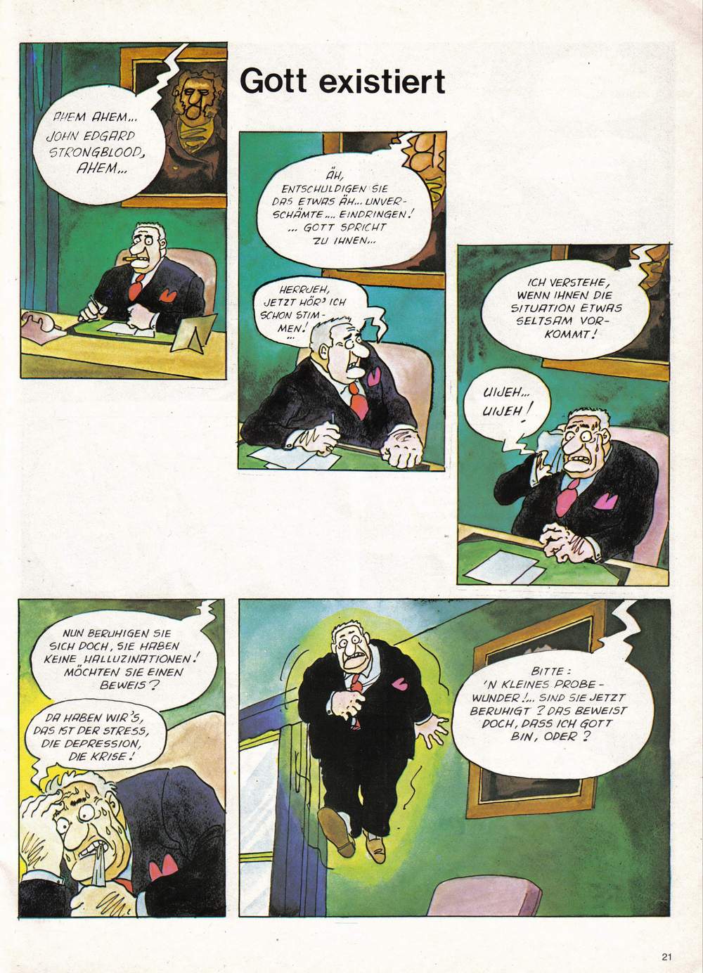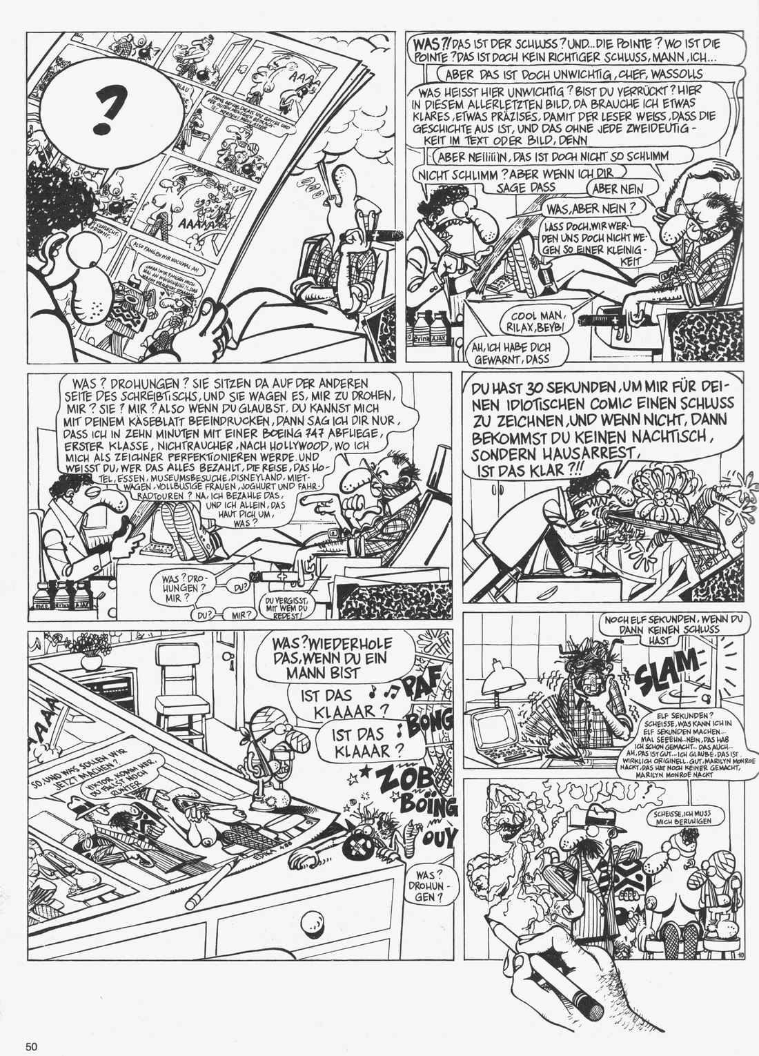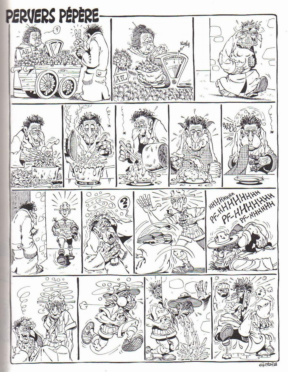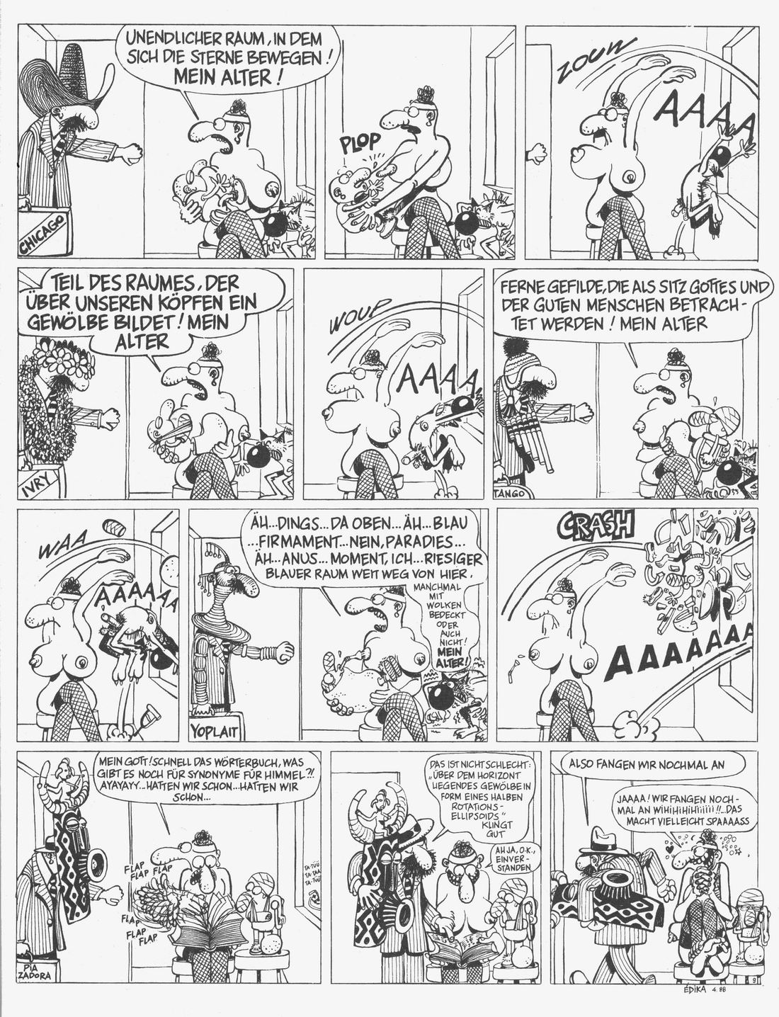 >>15170 Nun geht es weiter mit Edika, der hat seines Zeichens von Gotlib gelernt. Edika wusste nie wo seine Geschichten enden würden, dies führte manchmal dazu, dass er keine Ideen mehr hatte, sich die Geschichte irgendwo festgefahren hatte oder er nach dem Schluss noch 5 Seiten übrig hatte, in solchen Fällen erging er sich dann oft einfach in unzähligen Variationen des Themas.