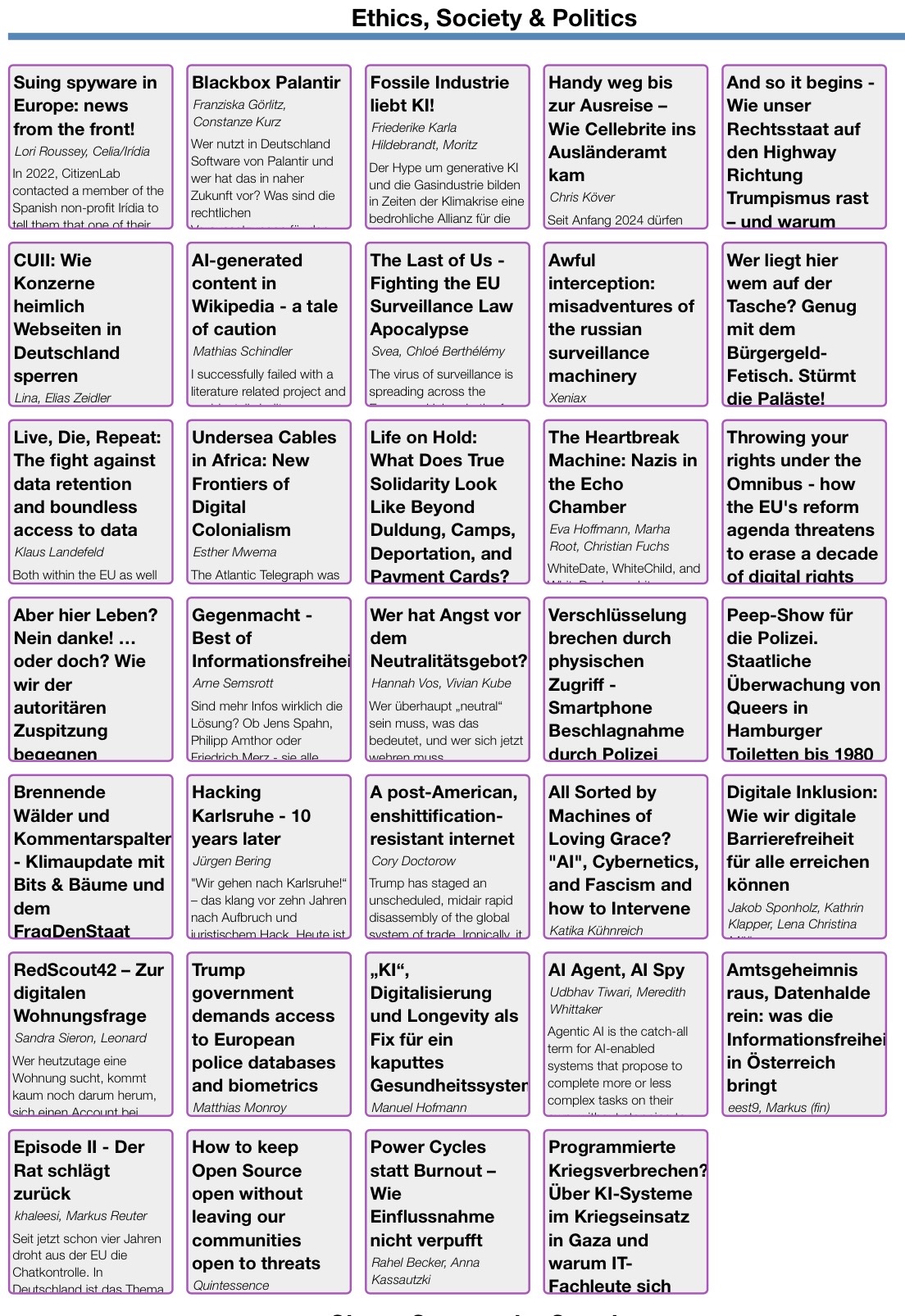 >>17906 Warum hängst du dich an der der gleichen Debatte auf, die vor 10 Jahren durchgekaut war, wie die anderen Bernde? Die aktuellen tech-politischen/-gesellschaftlichen Debatten sind Dinge wie dass Reiche einfach ein soziales Medium kaufen und eine Wahl manipulieren können. Wie dank KI die Wahrheit in Gefahr ist, Baudrillard ist relevanter denn je. Wie der Staat mehr denn je in unsere Privatsphäre eingreift. Der Energieverbrauch durch ML-Modelle, der heute schon einen signifikanter Anteil des weltweiten Energiebedarfs ausmacht. Die Debatte, ob es gut ist, dass wir jetzt noch mal so richtig CO2 in die Atmosphäre blasen, aber die KI dafür in ein paar Jahren all unsere Probleme löst. Das findet zumindest Sam Altman. In einer Welt, in der Tech-Milliardäre die Debatten prägen und Politiker ahnungslos sind, braucht es politische und gesellschaftliche Beiträge auf dem CCC mehr denn je als Gegenstimme zum Hauptstrom. Ihr könnt euch lustig machen über Zeug, das ihr irrelevant findet, aber ich finde es ehrlich gesagt wirklich armselig, wie hier zum Teil reale, zum Teil erfundene "irrelevante" Themen lächerlich gemacht werden, während die Realität deutlich relevanter ist. Und wenn es euch nicht interessiert: geht halt nicht hin. Es gibt im Halfnarp mehr Security-Veranstaltungen als "Ethics, Society & Politics". Und wenn es euch stört, dass im Saal nebenan über die Gesellschaft gesprochen wird, dann bleibt halt zuhause. Der Faden hat mehr Spott als ernste Kommentare. Ist das Kohlchan hier oder was? Wo man sich durch Ablehnung und Reaktionismus von allem, was auch nur ansatzweise als "linksgrün" interpretierbar ist, profilieren muss? Hier mal das aktuelle Programm zur Gesellschaft, damit ihr nicht mit 10-15 Jahre alten Kamellen anrücken müsst.