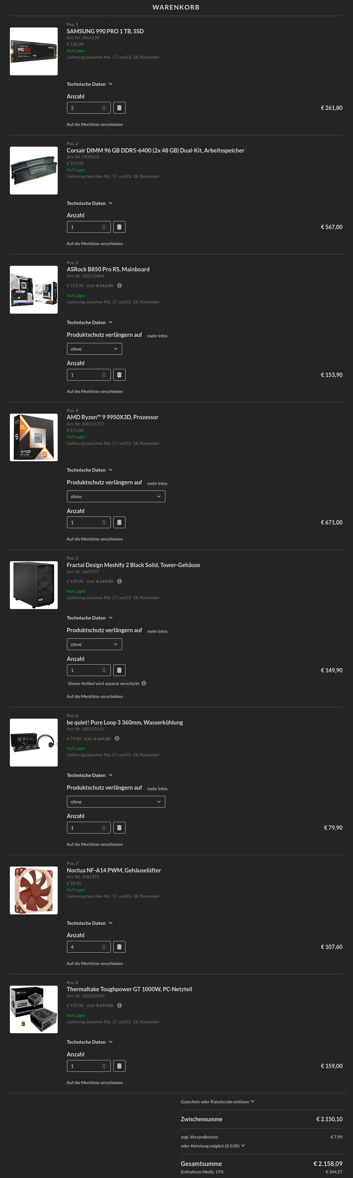 Was sagt Brunz? Brunz will sich nochmal nen neuen PC anschaffen, bevor Schreibtischcomputer komplett zum Luxusgut der reichen 1% verkommen, weil die Preise von RAM, SSD und GPU willenlos durch die Decke gehen dank der "KI"-Blase. GPU fehlt in der Liste, Brunz hat noch 1 unbenutzte RTX4070 Super rumliegen, die kommt in die Kiste.