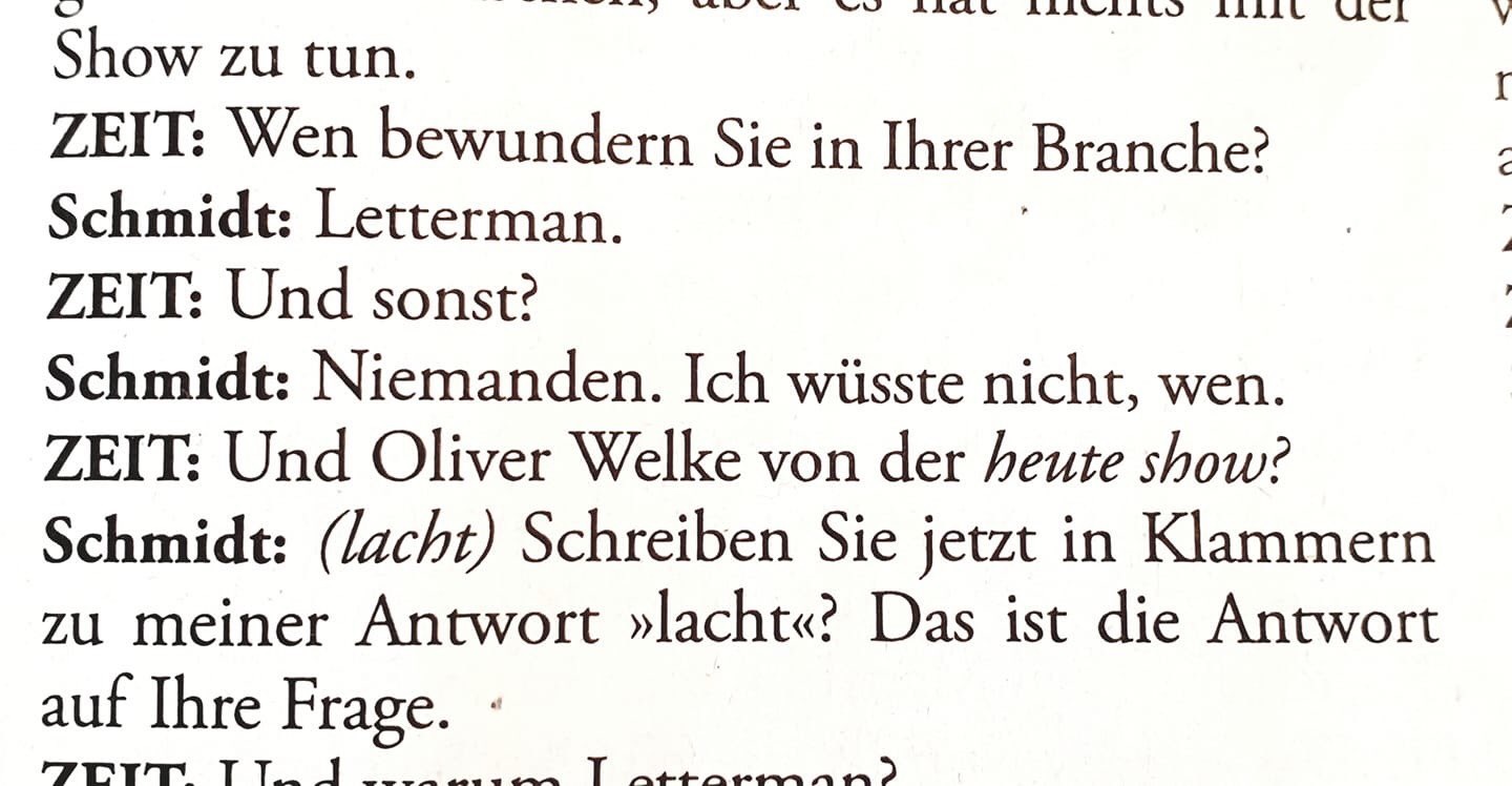 >>18022 Bernd hat sich nie für Harald Schmidt interessiert, aber alles Interviews mit ihm aus jüngeren Jahren, die er mal gelesen hat, machten ihn sehr sympathisch. Das von dem Bild hat Bernd nicht gelesen, aber er hat schon recht. Bernd fand die heute-Show noch nie lustig, aber als die während Corona kein Publikum mehr hatten, hat er mal in eine Folge reingeschaut und erst gemerkt WIE unlustig der Dreck eigentlich ist.