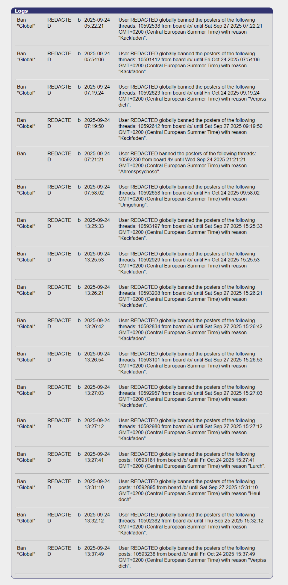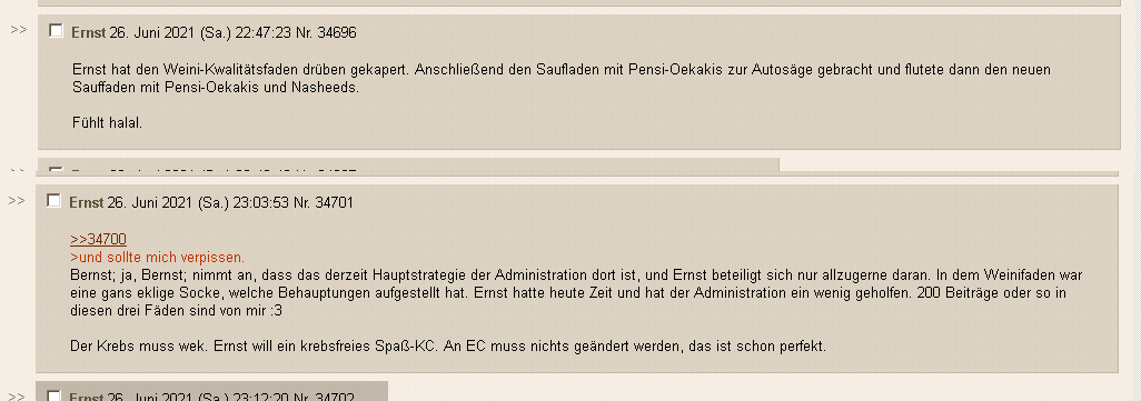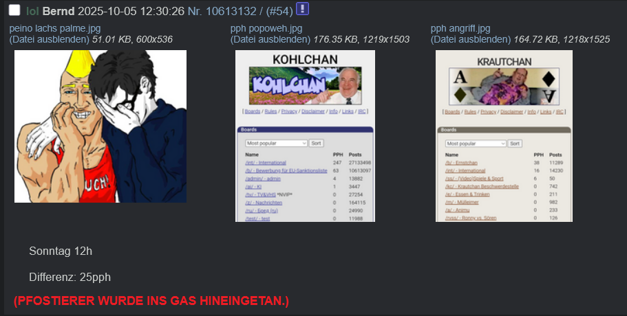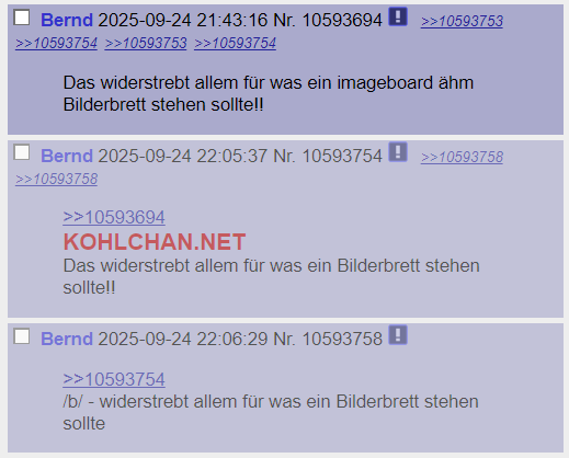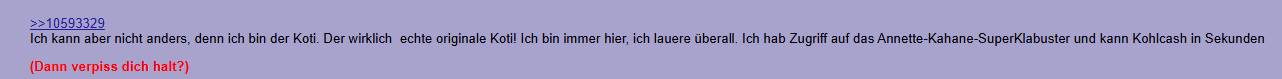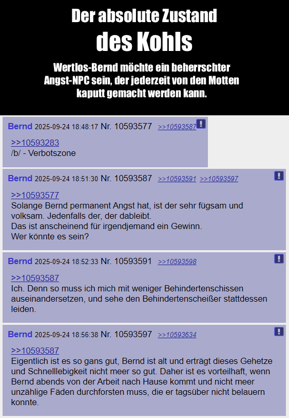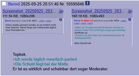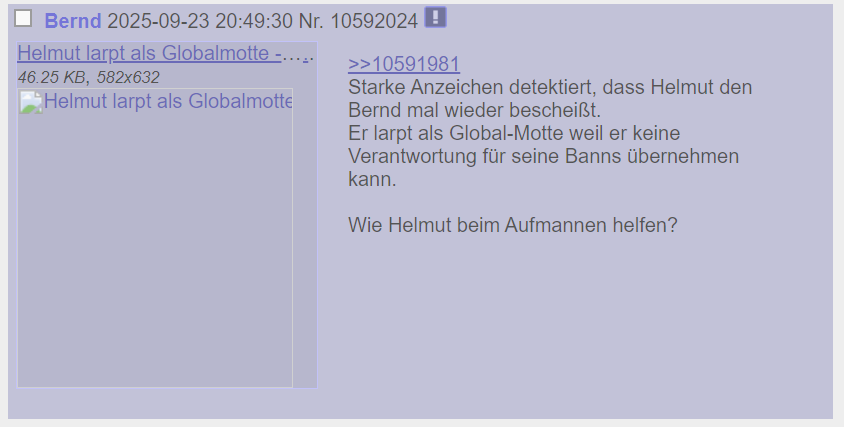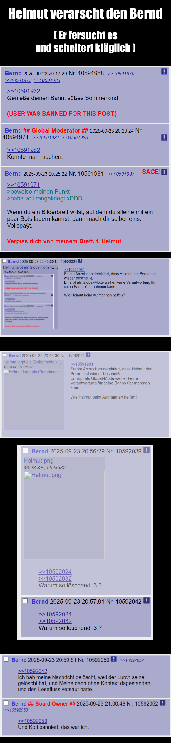 ... hat folgende Theorie zur momentanen Apokohlypse. Exkrementlancierer und Schizomotte machen insgeheim gemeinsame Sache und die Schizomotte ist die Störermotte. Exkrementlancierer bzw. die bots, die für ihn pfostieren, erstellt so viele Fäden wie es geht, mit einzelnem Bild und höchstens drei Sätzen etc., eben die generischste Art, wie Bernd Fäden eröffnet - eben so, dass es gerechtfertigt scheint, jeden stinknormalen Faden zu bannieren. Wozu? Um möglichst viel "Kollateralschaden" an Bernds zu bannieren, damit das Brett stirbt. Man tut so, als wäre es ein Krieg zwischen Exkrementlancierer und der Motte, in Wirklichkeit sind es Exkrementlancierer und Motte gegen Bernd, Helmut denkt die Motte macht gute Arbeit weil er ja "konsequent" gegen Exkrementlancierer vorgeht, Exkrementlancierer umgeht derweil natürlich 100 mal pro Tag seine Bannierung. Seine Fäden werden nicht gelöscht, keine autosäge, soll weitere Bernds dazu bringen, in diesen Fäden Kritik an der Motte auszuüben, damit diese ebenfalls banniert werden. Würde die Motte ernsthaft gegen Exkrementlancierer vorgehen wollen, würde seine scheiße konsequent gelöscht werden und wenn er dann Heulifäden aufmacht ob der Löschung weiss man wenigstens, dass er es ist. So wird aber nicht gehandelt. Es wird alles so runter gespielt, dass maximal viele Bernde banniert werden. Und wenn /b/ dann tot ist, ist /int/ als nächstes dran und dann kommt Krautchan. Krautchan muss tierisch aufpassen, wer hier moderiert und am besten harte, unbequeme Spielregeln für die Motten aufstellen. Wer OPs bannt, muss die Fäden löschen statt sich in dem Faden mit OP zu streiten, weil der Bann sofort umgangen ist. Ich hoffe wirklich, dass die Administration hier ausreichend Ficks gibt und versucht, aus den Fehlern der Vorgänger zu lernen.
