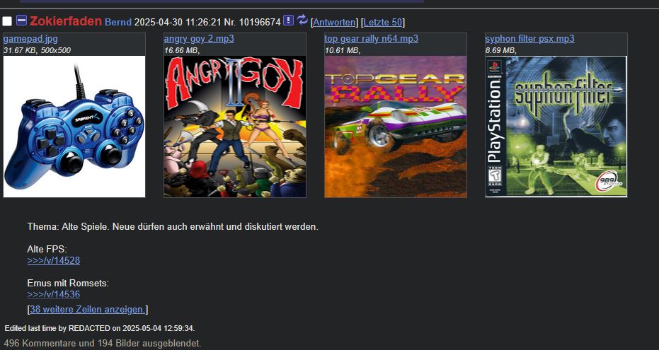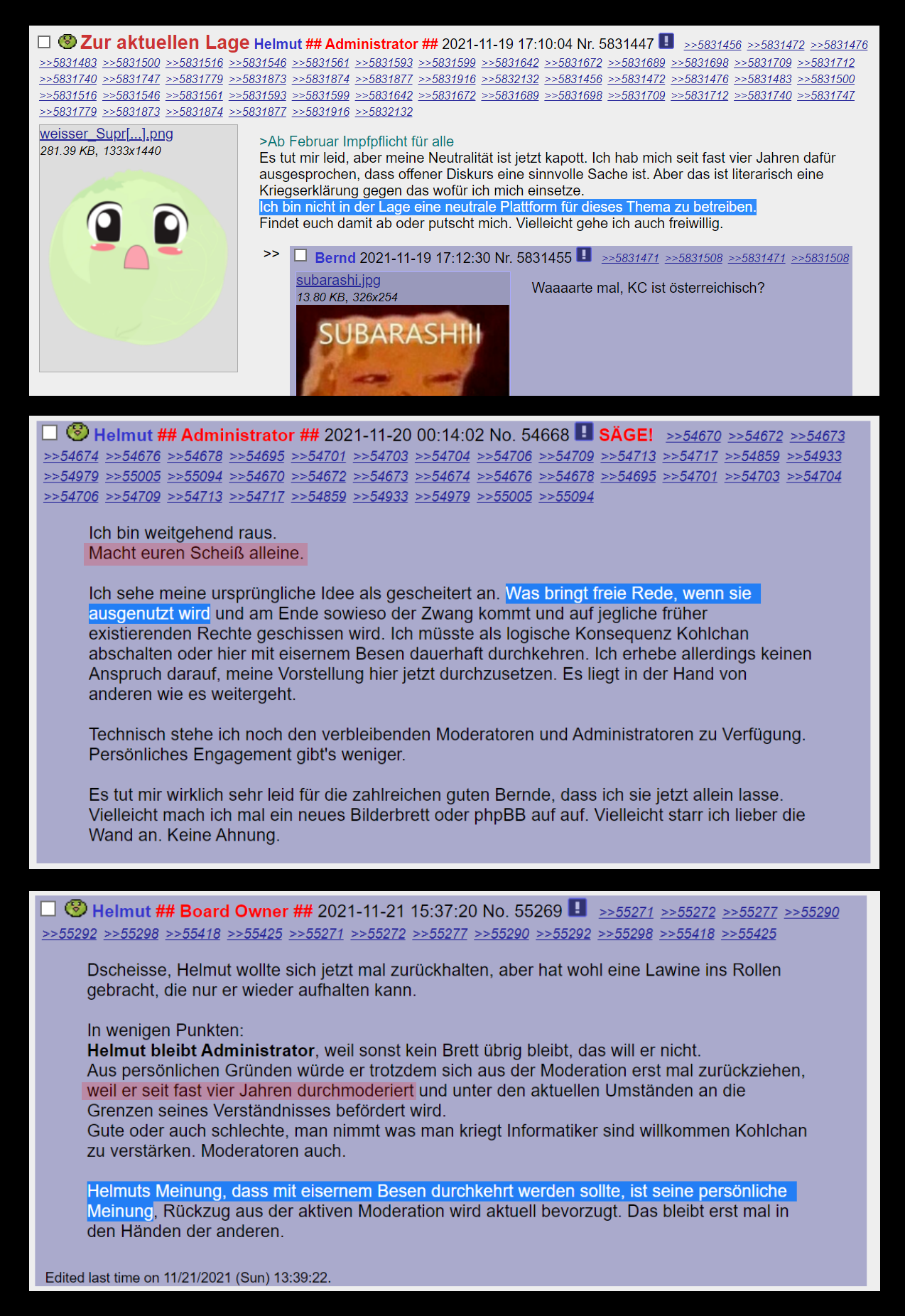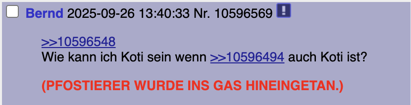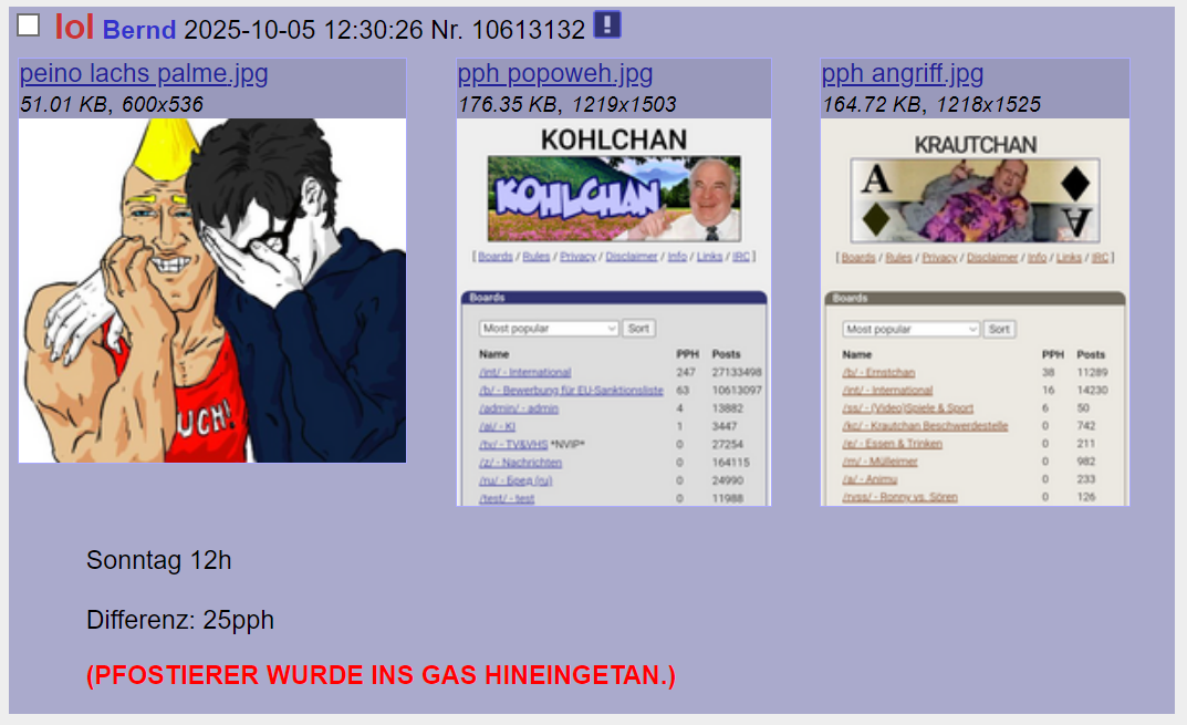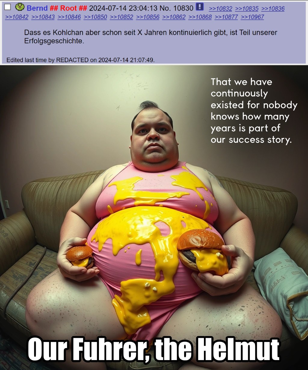 ... hat folgende Theorie zur momentanen Apokohlypse. Exkrementlancierer und Schizomotte machen insgeheim gemeinsame Sache und die Schizomotte ist die Störermotte. Exkrementlancierer bzw. die bots, die für ihn pfostieren, erstellt so viele Fäden wie es geht, mit einzelnem Bild und höchstens drei Sätzen etc., eben die generischste Art, wie Bernd Fäden eröffnet - eben so, dass es gerechtfertigt scheint, jeden stinknormalen Faden zu bannieren. Wozu? Um möglichst viel "Kollateralschaden" an Bernds zu bannieren, damit das Brett stirbt. Man tut so, als wäre es ein Krieg zwischen Exkrementlancierer und der Motte, in Wirklichkeit sind es Exkrementlancierer und Motte gegen Bernd, Helmut denkt die Motte macht gute Arbeit weil er ja "konsequent" gegen Exkrementlancierer vorgeht, Exkrementlancierer umgeht derweil natürlich 100 mal pro Tag seine Bannierung. Seine Fäden werden nicht gelöscht, keine autosäge, soll weitere Bernds dazu bringen, in diesen Fäden Kritik an der Motte auszuüben, damit diese ebenfalls banniert werden. Würde die Motte ernsthaft gegen Exkrementlancierer vorgehen wollen, würde seine scheiße konsequent gelöscht werden und wenn er dann Heulifäden aufmacht ob der Löschung weiss man wenigstens, dass er es ist. So wird aber nicht gehandelt. Es wird alles so runter gespielt, dass maximal viele Bernde banniert werden. Und wenn /b/ dann tot ist, ist /int/ als nächstes dran und dann kommt Krautchan. Krautchan muss tierisch aufpassen, wer hier moderiert und am besten harte, unbequeme Spielregeln für die Motten aufstellen. Wer OPs bannt, muss die Fäden löschen statt sich in dem Faden mit OP zu streiten, weil der Bann sofort umgangen ist. Ich hoffe wirklich, dass die Administration hier ausreichend Ficks gibt und versucht, aus den Fehlern der Vorgänger zu lernen.