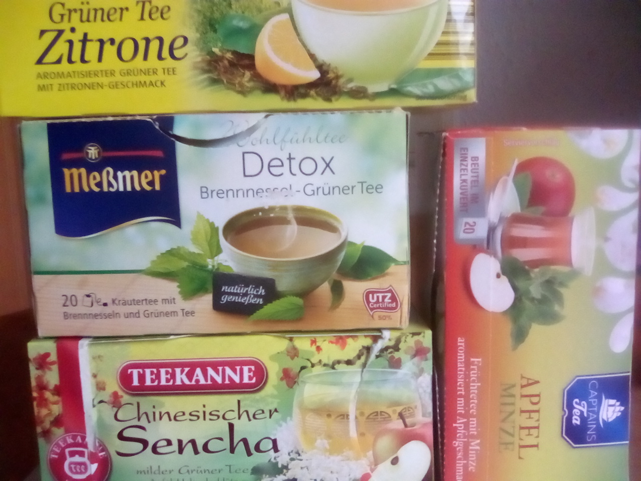 Ich bin mittlerweile in der Kräutertee-Phase. Besonders die Mischungen mit Zitronenmelisse, -gras oder -verbene. Vorher hab ich ziemlich viel Rooibos-Varianten getrunken, das geht aber grad aus unerfindlichen Gründen garnicht. Vielleicht hab ichs übertrieben oder so.