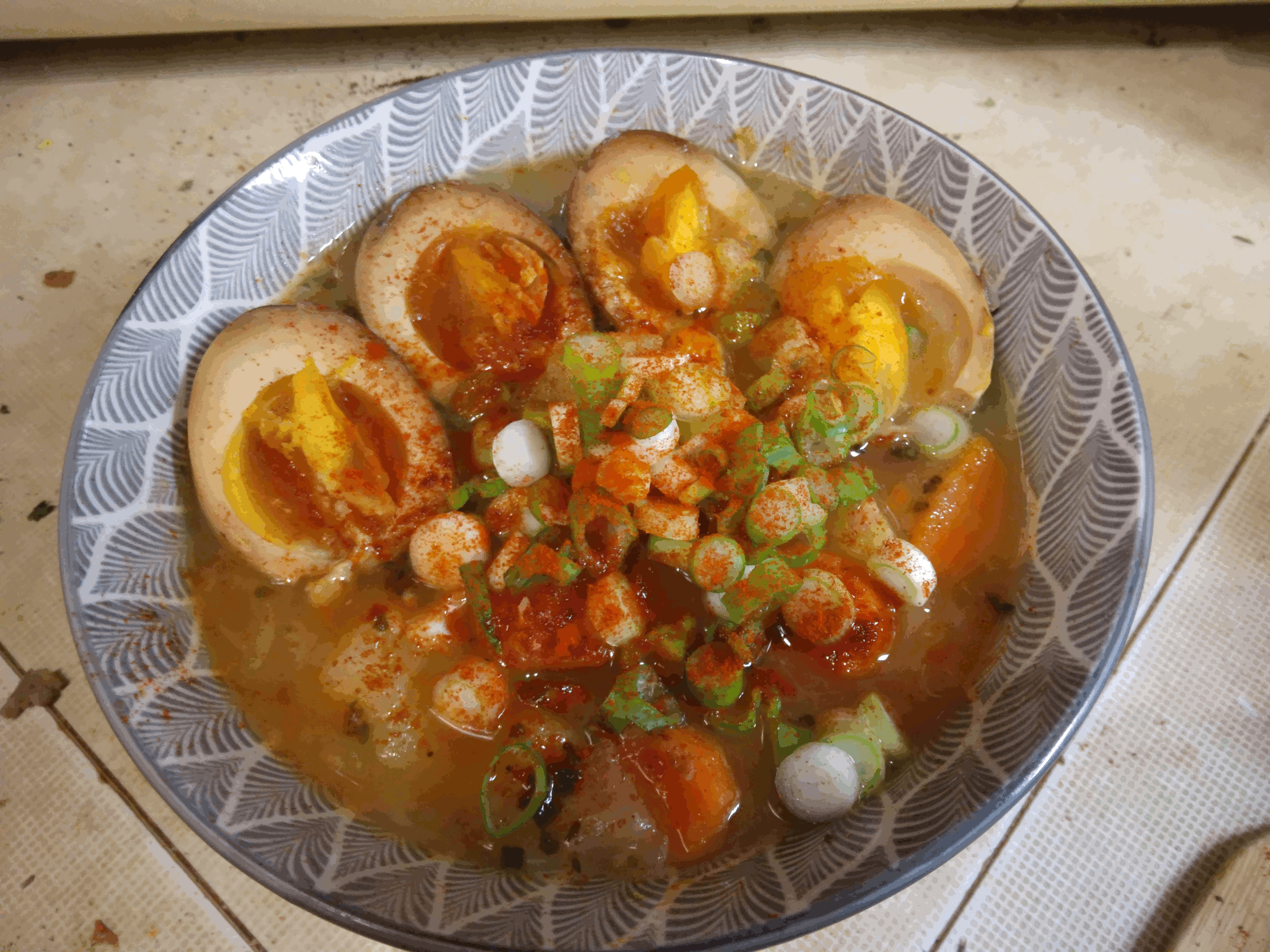 Eigentlich eine Fischsuppe, aber Bernd hat zu viel Kartoffeln dazu gegeben. Deshalb ist es eher eine Kartoffelsuppe mit Fisch geworden, garniert mit marinierten Eier, Frühlingszwiebel und Cayennepfeffer