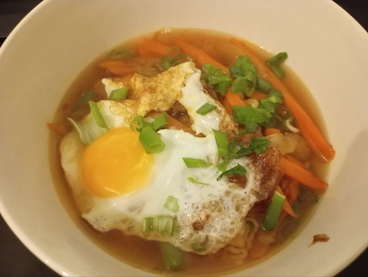 zum Garnieren eine Frühlingszwiebel, frische Kräuter oder feine Algenstreifen