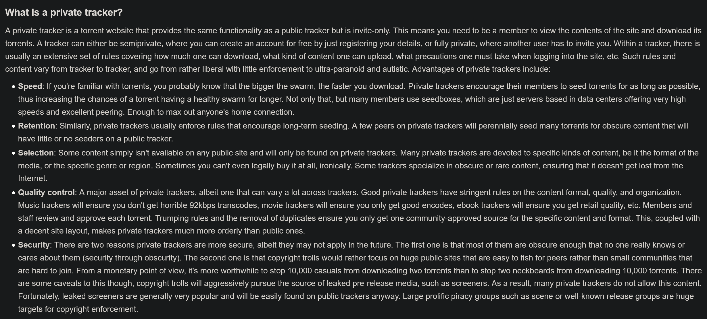 >>16337 Why are you so mad? Nobody forces you to use private trackers. The private toilet will always be better and cleaner than the public one. https://igwiki.lyci.de/wiki/Private_trackers