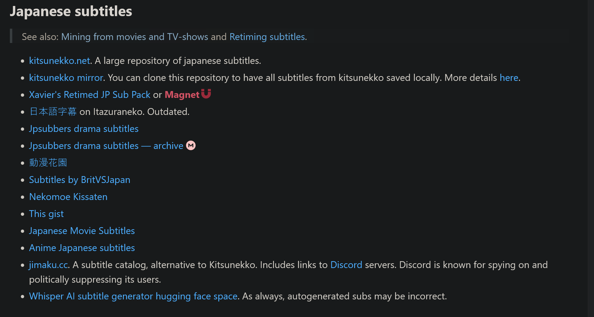>>16307 >My main issue is finding a good source of jp subs for anime. Don't the JP BDMVs have them usually? I guess you already know these sites: https://animelon.com/ https://tatsumoto.neocities.org/blog/resources