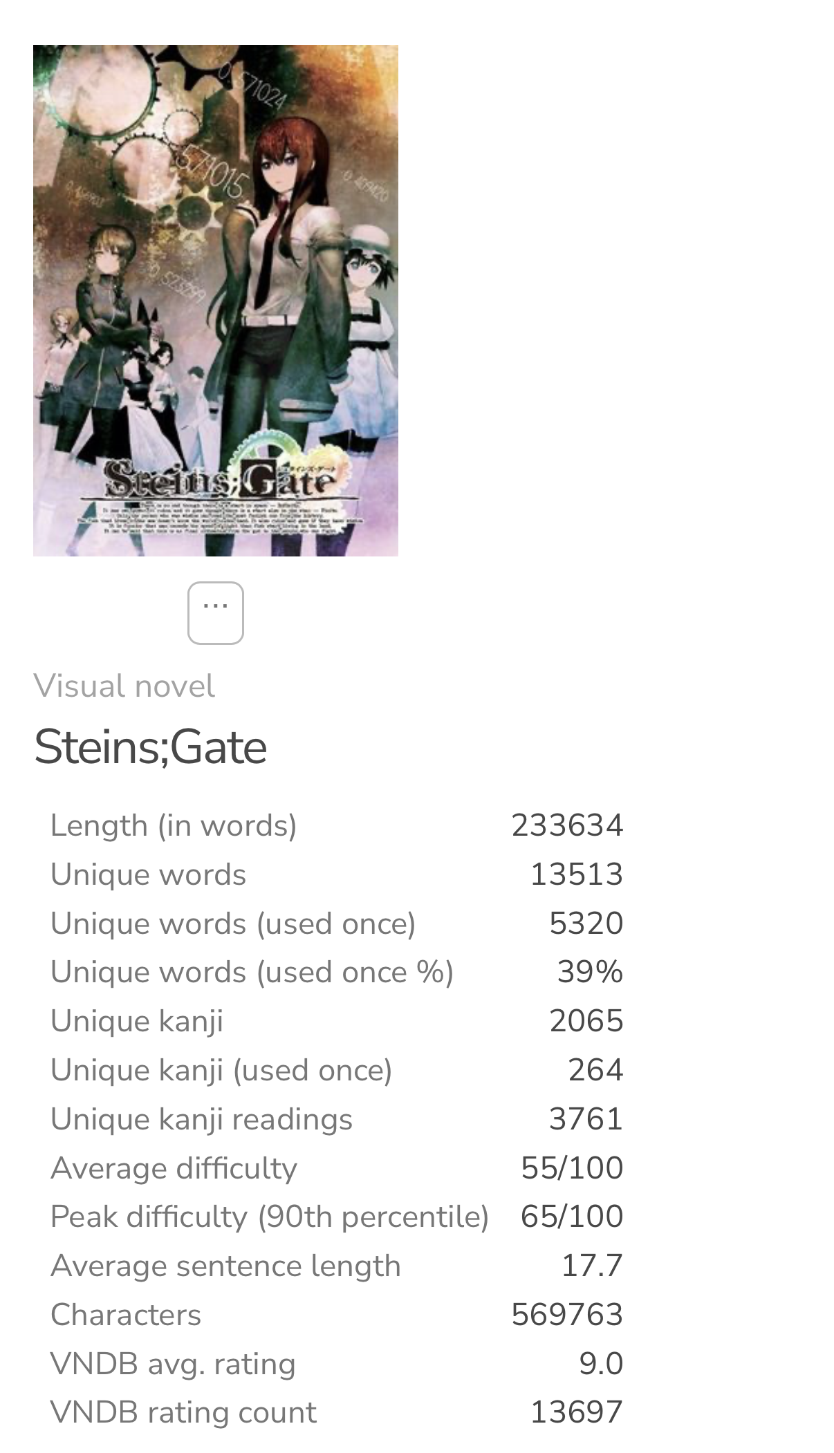 Bernd hatte überlegt, sein rostiges japanisch mit Steins;Gate aufzufrischen, aber bei >2000 verschiedenen kanji und >10k unterscheiden Wörtern hat er wohl keine Chance.