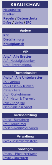 Thema Seitenleiste. Vor allem möchte ich erfahren, ob das beobachtete Verhalten so gedacht ist, oder ein Problem auf meiner Seite. Ich kann alles außer "Andere" und natürlich "KRAUTCHAN" einklappen. Wenn ich die Seite neu lade, ist alles wieder ausgeklappt. Ist das so gewollt? Wenn ja, warum? Ich brauche z. B. die "Krebsabteilung" überhaupt nicht. Drinbevor mein Faden landet gleich da.