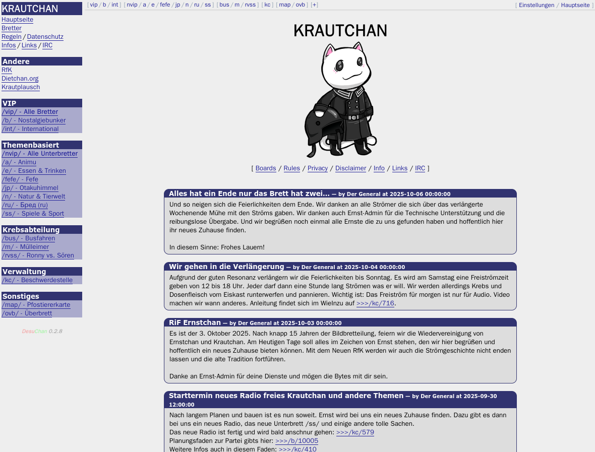 Meine Kameraden. Meine Kameraden, ich liebe es, das Radio. Meine Kameraden, ich liebe das Radio Meine Kameraden! Ihr alle wisst wie sehr ich das Radio liebe! Ich liebe das Internet-Radio, ich liebe die Musikwünsche, ich liebe die gute Stimmung, während eines anständigen Ströms... https://radio.krautchan.org/ Meine Kameraden! Das neue Radio freies Krautchan steht uns unmittelbar bevor. Am 03.10.2025 werden wir die älteste Spaltung der KC-Geschichte Rückgängig machen und uns nach gut einer Dekade wieder mit Ernst vereinigen. Könnte es ein passenderes Datum geben? Meine Kameraden! Wir wollen an diesem Tag nicht nur das Ende einer ernsten Ära betrauen. Nein, meine Kameraden! Wir wollen auch die Wiedervereinigung feiern und die Fortführung einer altehrwürdigen Tradition, im Form von Ernstiwan und RfK. Hierzu sind alle alten Ström-Ernste eingeladen, ihren auch hier funktionierenden Zugang zum Radio zu nutzen und ordentlich aufzulegen. Test-Ströms bis zum 03.10 sind ausdrücklich erwünscht. Dieser Faden kann und darf gerne für Reportierung von Radio-Käfern verwendet werden. Planungsfaden gibts hier >>>/b/10005 English party-thread here >>>/int/13411