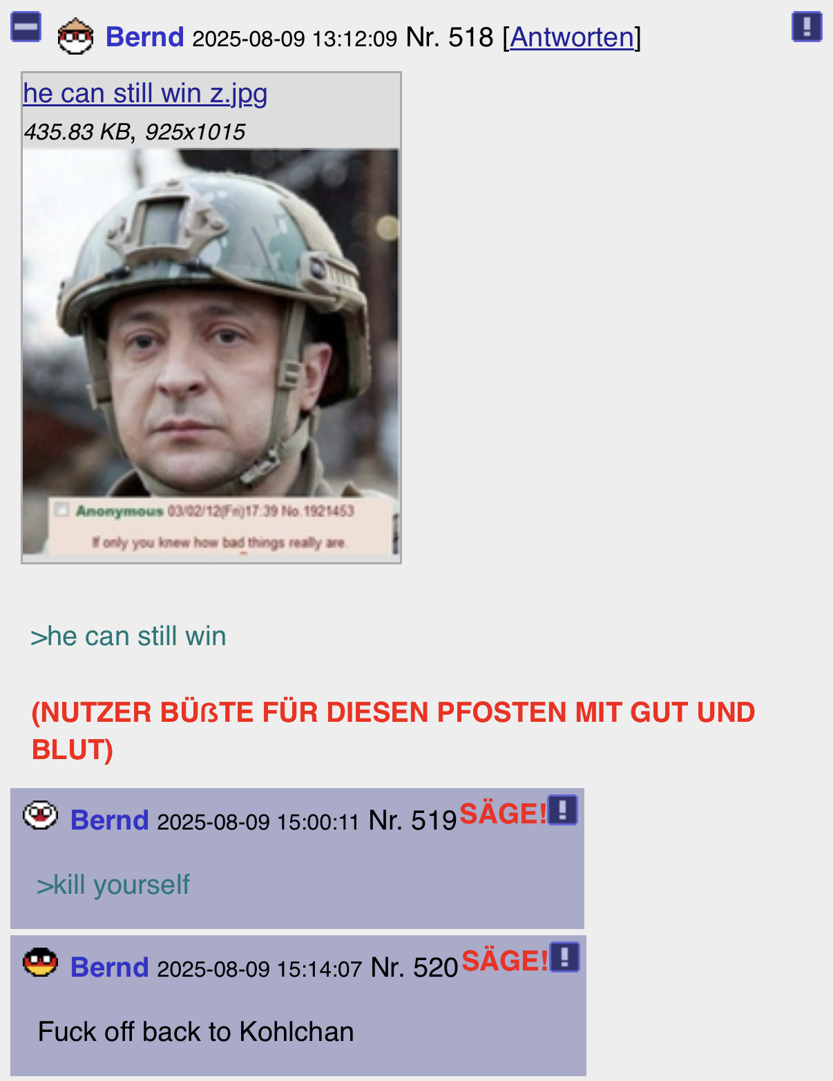 You have been told to go back to Kohlchan, you got banned and your thread got moved to the garbage board. Protip: Delete this or you'll get permabanned for ban evasion.