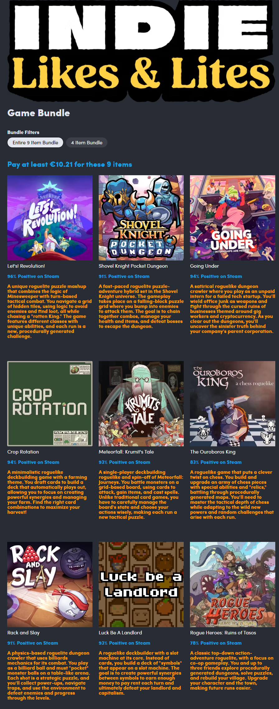 Am besten an Schurkenartigen (Bernd verzichtet auf eine Unterscheidung zwischen Schurkenartigen und Schurkenleichten Roguelites) gefällt ihm die Aufgabe, aus zufällig generierten Situationen das Bestmögliche rauszuholen, und dass es nicht den einen Weg zum Ziel gibt, der immer funktioniert. Das ist für ihn die Antithese zu 100%-Spielern und Dampferrungenschafts-Jägern, die alles vollständig haben wollen. Umgekehrt macht es doch viel mehr Spaß: Da sind deine Sachen, mehr gibt es nicht, und jetzt sieh zu, wie du klar kommst :3