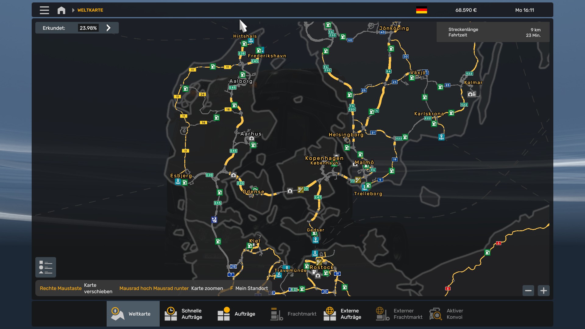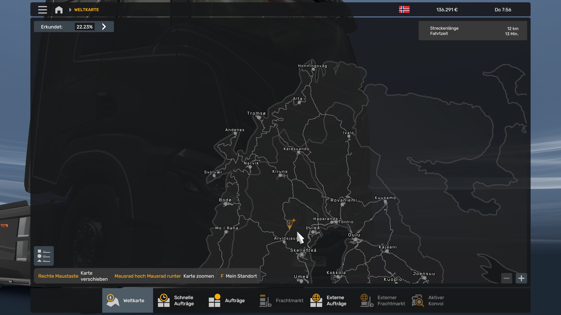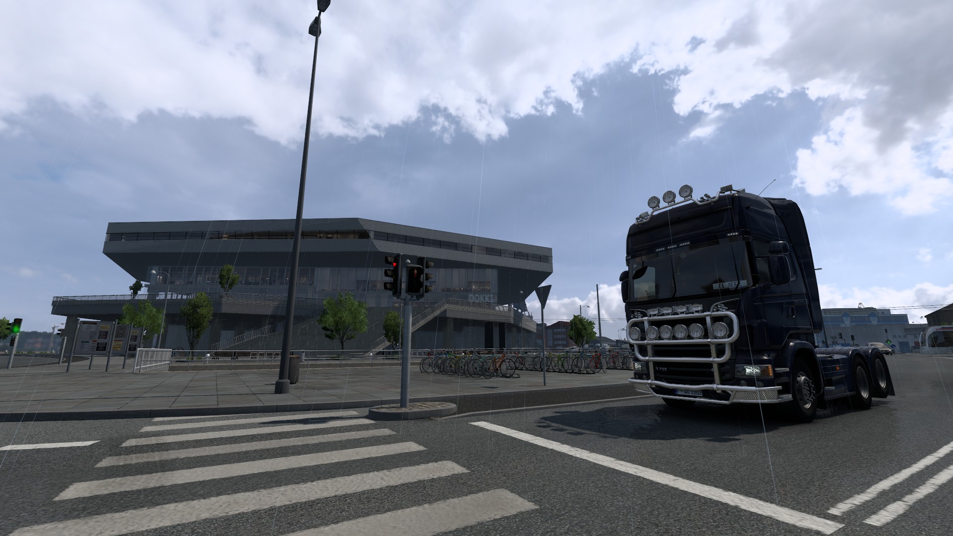 Die beiden 1.57-Versionen sind draußen. Hier erstmal die Eindrücke aus ETS2. Weil ich zur Vorbereitung Skandinavien fast komplett bereist habe, fällt auf: Die meisten Straßen haben sich (im Verlauf) nicht verändert, nur die ausgegrauten Stückchen zwischendrin. Mal sehen, wie es dann vor Ort tatsächlich ist. Erste Fahrt nur bis Esbjerg. Jetzt ist eine Grenzkontrolle zwischen Deutschland und Dänemark. Die mögen uns wohl nicht mehr.