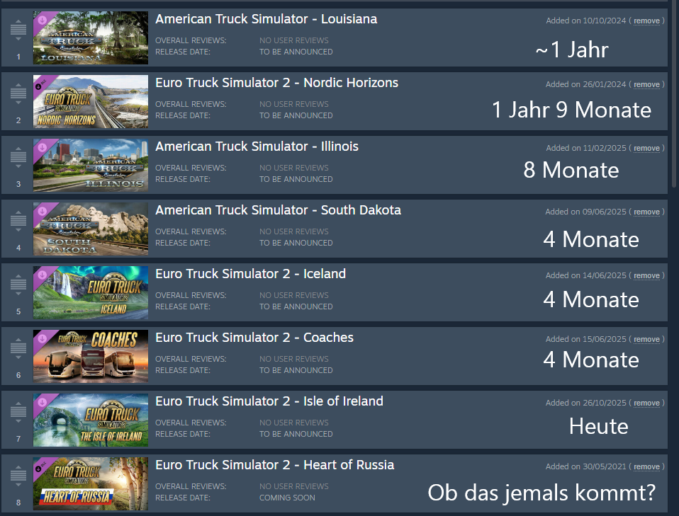 >>46 > AM SPIEL GEÄNDERT Wenn man selten Spielt, wäre eine Möglichkeit, bei einer Beta zu bleiben, bis man aufdatieren WILL oder bis die Beta gelöscht wird, das dauert aber Jahre - die älteste verfügbare Beta für ETS2 ist 1.31 (Mai 2018). Allerdings fehlen zwischendurch einige Versionen. Weil Steam ihnen nur eine bestimmte Menge zugesteht, werden die mit den wenigsten Spielern zuerst abgemurkst.